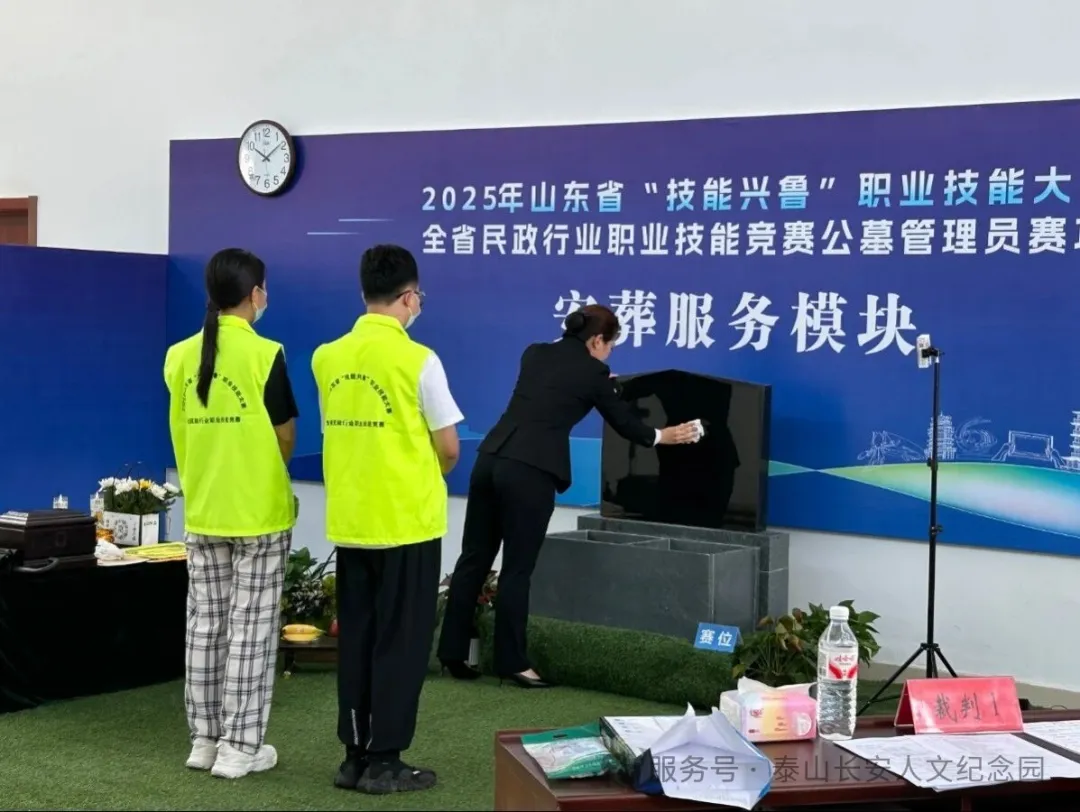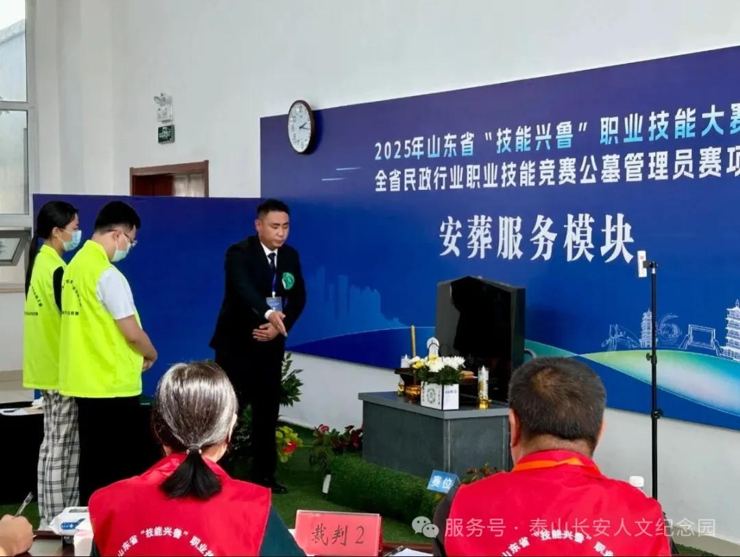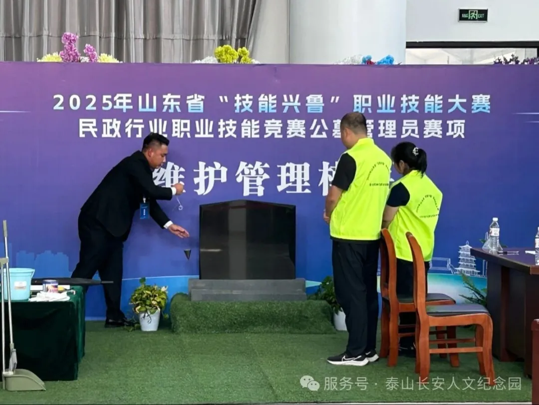 经过市级内部选拔比拼,泰山长安人文纪念园程龙、梁文嘉两名选手成功晋级,代表泰安市参加公墓管理员赛项。在为期四天的激烈角逐中,选手们围绕"接待引导"、"安葬服务"、"祭奠服务"、"维护管理"四大专业模块同台竞技。经过理论考试和操作技能竞赛,两名选手凭借扎实的专业功底和出色的现场表现,在强手如林的赛场上脱颖而出。